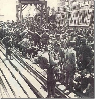 Landing of Greek soldiers at the docks. Smyrna 1919